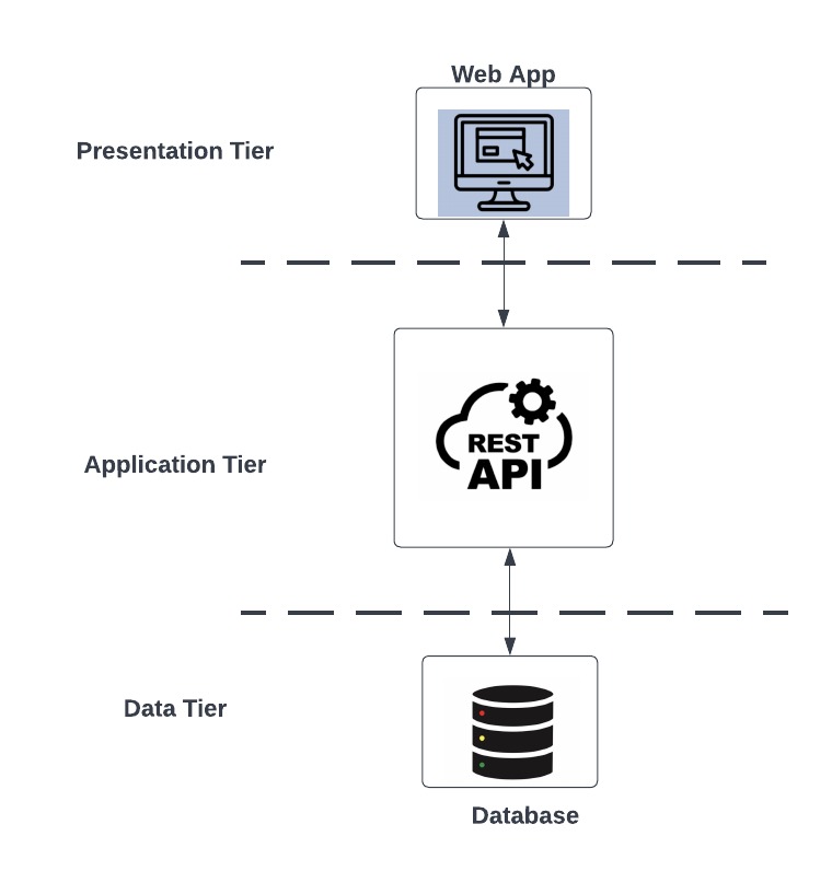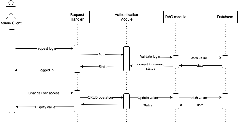 Based on the system's requirements, we identified five main components. The database, REST API (authentication module, DAO Module, and Request Handler Module), and The five core components are the five core components. Each of these components belongs to one of three tiers in a multi-tier design. The data tier is in charge of data storage and retrieval. The database module is included in this tier. All business logic, including permission and access control, is handled by the application tier. This tier is made up entirely of the REST API, which is made up of the Authentication module, the DAO module, and the Request Handler module. The presentation tier serves as the system's external interface. The web application is part of this tier. In the presentation tier, the web application talks to the REST API modules in the application tier, and the REST API talks to the database module in the data tier.